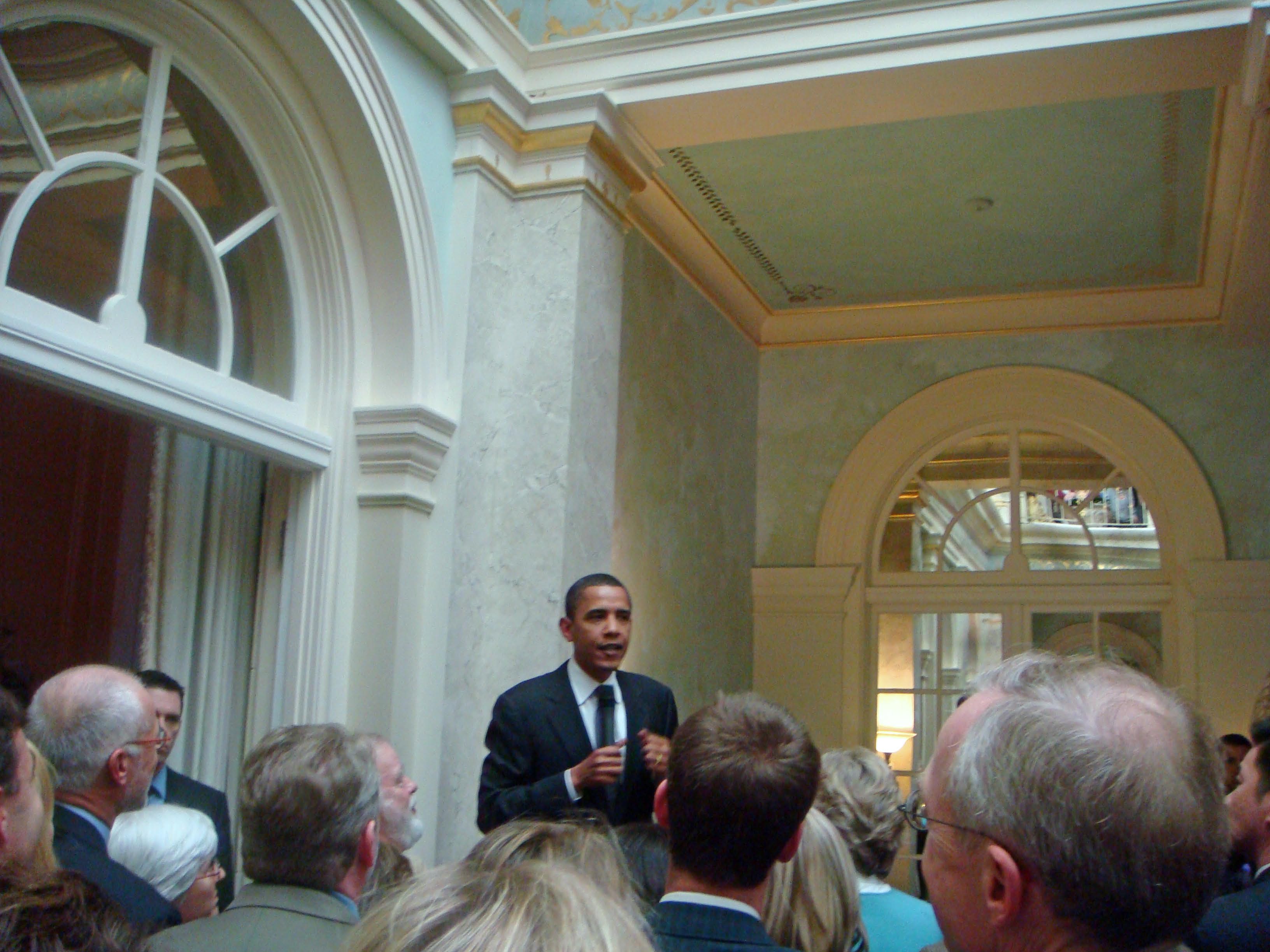 Barack speaks at the Getty homeTonight, my wife and I had the privilege of attending a small reception for Barack Obama at the home of Ann and Gordon Getty.  All I can say, is he is more impressive and more fun in person than on TV.  They closed off the street in front of the Getty’s home which is on Broadway and Lyon in San Francisco .  We were just going in when he showed up right on time along with about 20 secret service people etc . He jumped out of the car with a huge grin on his face and said “Hi guys!  I’ll see you inside”.    About fifteen minutes later he came into this rather large room (the Getty’s are good people but they live like they are the Medici Family so think of this as being more a palace than a house”.  He joked about the place not being up to his standards.  Then he began to give his stump speech.  The crowed was in rapture not because they were hearing some God speak but because they were hearing a real human being speak.  Here are the things that had an impact on me: