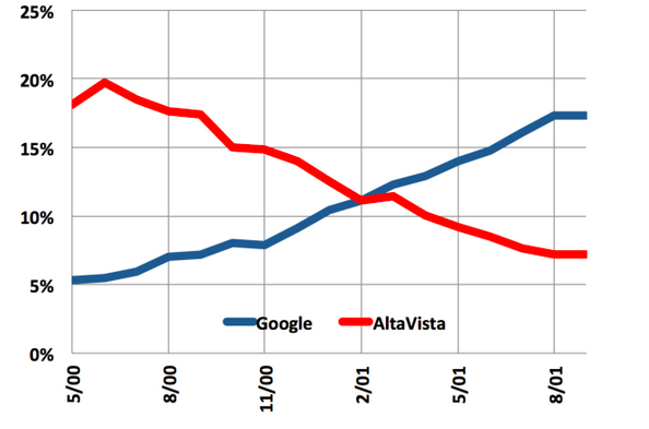 As part of the CMGI acquisition of Alta Vista, I joined its board. Alta Vista under Rod Schrock’s leadership moved from being a Search Company to becoming an Internet Portal. Basically, Alta Vista had Yahoo envy. At the same time Google had Alta Vista envy. I think part of the issue for Alta Vista was not having a vision for how to monetize search (Google would eventually figure this our with ad words and ad sense). Advertising on the internet was pretty much banner ads at that time. I would like to say that I pushed against this move by Alta Vista but I don’t think I did. The Alta Vista board knew about Google and considered acquiring it. We had some discussions with them but they had just raised $25 million from Kleiner Perkins and other key VCs and were really not interested. I think the valuation of Google was about $80 million at that time. There were probably only 12 or so people at Google then. While Alta Vista was the most powerful and popular search engine, Larry Page one of the founders of Google had figured out how to make search results more relevant. That combined with Alta Vista move to becoming a Portal, created the opportunity for Google to become the leader in search.