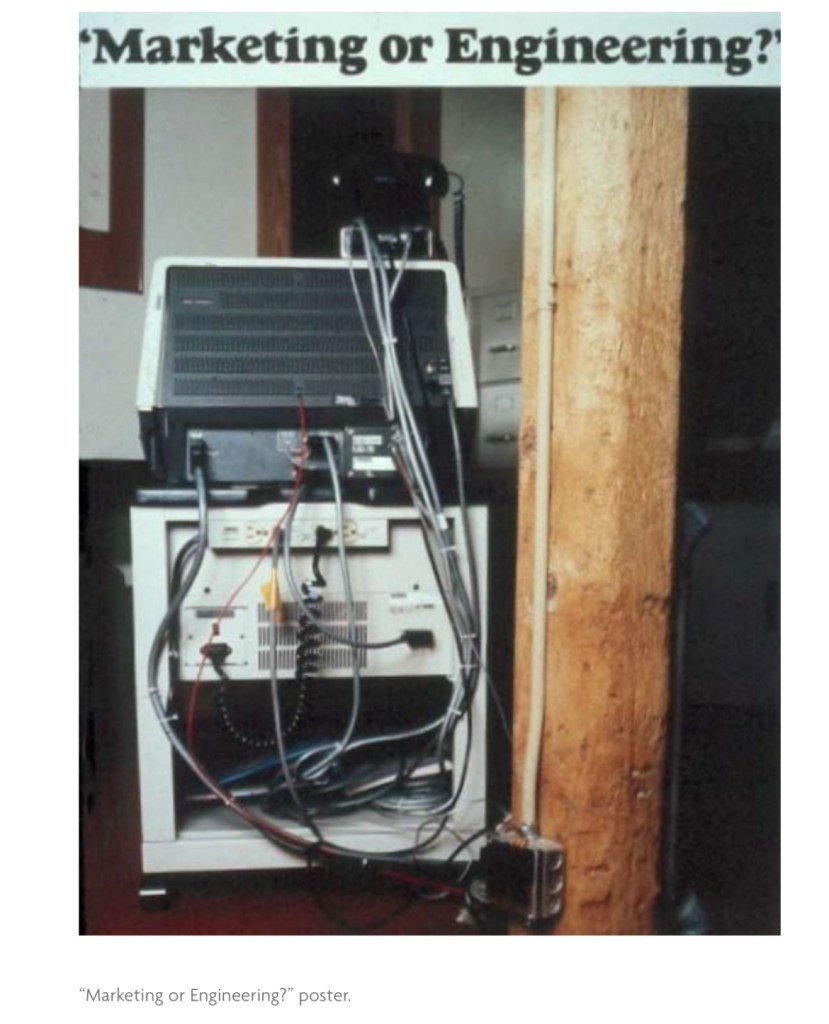 One day, posters started to appear thought the Mill (the headquarters of Digital Equipment in Maynard MA) showing the backside of the DECmate and with the caption “Marketting or Engineering” which I took to be a question about who was responsible. Since I was now the manager of the engineering group responsible for the DecMate, I looked into who had made this poster and was alarmed to learn that it was the CEO, Ken Olsen.
