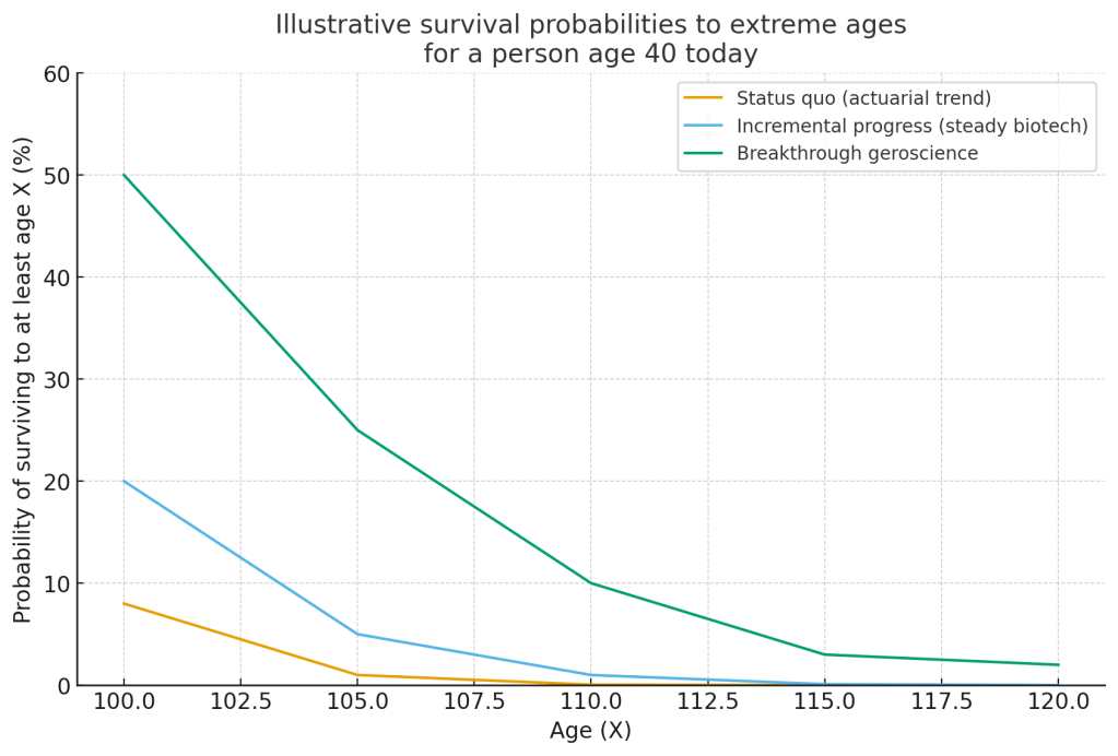 If you’re 40 today, actuarial tables suggest you’ll live to about 85 on average. With steady medical progress, 95 is realistic for many. Already, the healthiest 20% have good odds of crossing 100. But that does not account for breakthroughs that are likely in the coming decades. Already, drugs like the GLP-1s are transforming metabolic health, and that’s just the beginning. Advances in gene editing, regenerative medicine, and AI-driven drug discovery could push the boundaries even further. I’ll go out on a limb: I believe some of you will live not just to 100 or 110, but to 120.
